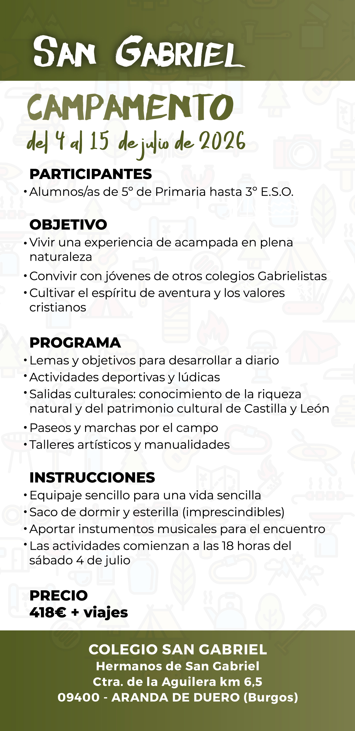 Estan adreçats a nois i noies des de 6è EP fins a 3r d’ESO. Es realitzen a les instal·laciones del Col·legi San Gabriel de Aranda de Duero. L’objectiu principal és construir un grup d’amistat on es visqui l’alegria de la unitat i l’acceptació de tots. Es conviu en acampada amb nois i noies d’Espanya que junts desenvolupen projectes pedagògics i lúdics a través de tallers, activitats i excursions, marxes i sortides culturals.